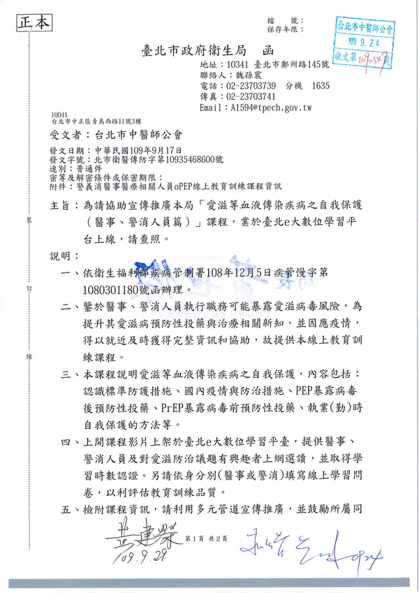 | 台北市中醫師公會 官網:http://www.tpcma.org.tw 地址:台北市中正區青島西路11號3樓 E-mail:tp.cma@msa.hinet.net 電話:(02)2314-3456(代表號) 傳真:(02)2314-8181 |