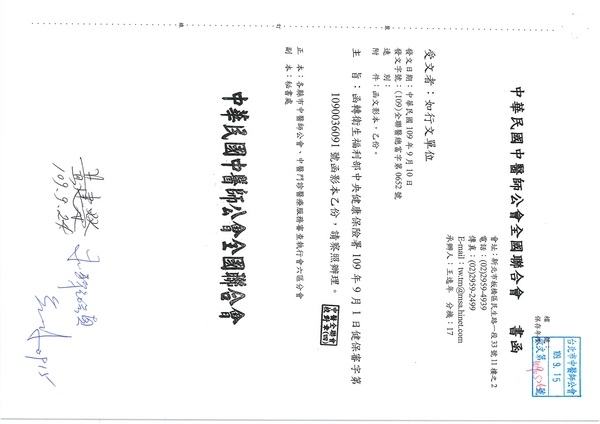 | 台北市中醫師公會 官網:http://www.tpcma.org.tw 地址:台北市中正區青島西路11號3樓 E-mail:tp.cma@msa.hinet.net 電話:(02)2314-3456(代表號) 傳真:(02)2314-8181 |