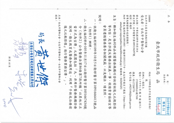 | 台北市中醫師公會 官網:http://www.tpcma.org.tw 地址:台北市中正區青島西路11號3樓 E-mail:tp.cma@msa.hinet.net 電話:(02)2314-3456(代表號) 傳真:(02)2314-8181 |