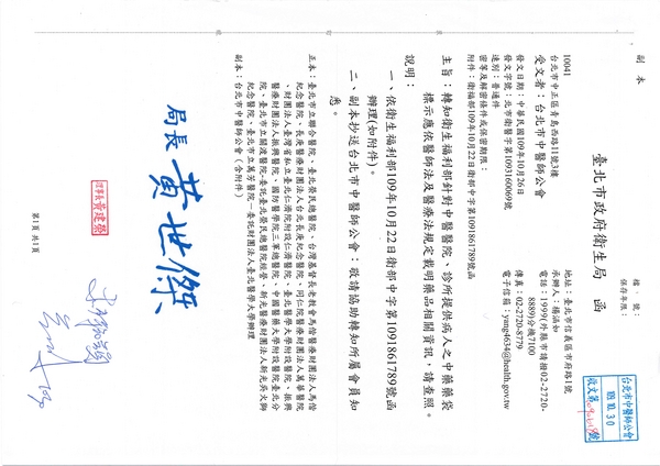 | 台北市中醫師公會 官網:http://www.tpcma.org.tw 地址:台北市中正區青島西路11號3樓 E-mail:tp.cma@msa.hinet.net 電話:(02)2314-3456(代表號) 傳真:(02)2314-8181 |