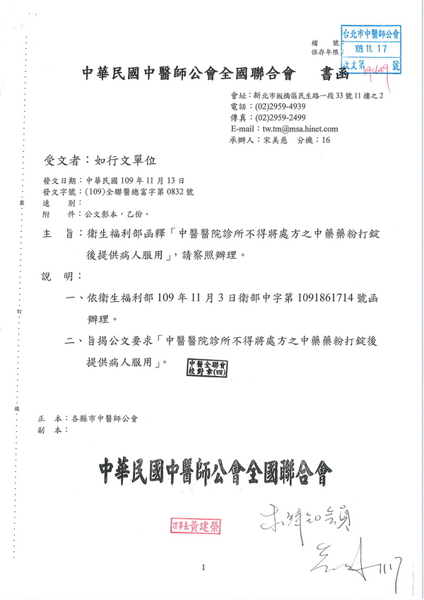 | 台北市中醫師公會 官網:http://www.tpcma.org.tw 地址:台北市中正區青島西路11號3樓 E-mail:tp.cma@msa.hinet.net 電話:(02)2314-3456(代表號) 傳真:(02)2314-8181 |