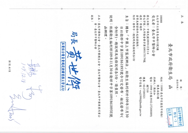 | 台北市中醫師公會 官網:http://www.tpcma.org.tw 地址:台北市中正區青島西路11號3樓 E-mail:tp.cma@msa.hinet.net 電話:(02)2314-3456(代表號) 傳真:(02)2314-8181 |