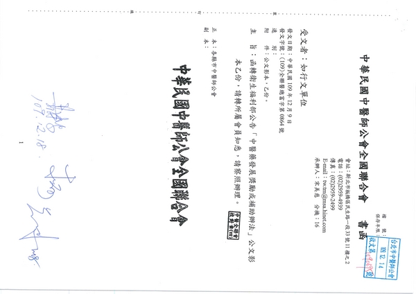 | 台北市中醫師公會 官網:http://www.tpcma.org.tw 地址:台北市中正區青島西路11號3樓 E-mail:tp.cma@msa.hinet.net 電話:(02)2314-3456(代表號) 傳真:(02)2314-8181 |