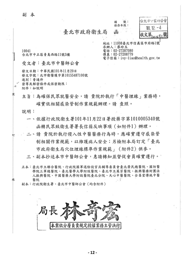 | 台北市中醫師公會 官網:http://www.tpcma.org.tw 地址:台北市中正區青島西路11號3樓 E-mail:tp.cma@msa.hinet.net 電話:(02)2314-3456(代表號) 傳真:(02)2314-8181 |
