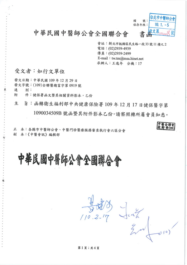 | 台北市中醫師公會 官網:http://www.tpcma.org.tw 地址:台北市中正區青島西路11號3樓 E-mail:tp.cma@msa.hinet.net 電話:(02)2314-3456(代表號) 傳真:(02)2314-8181 |