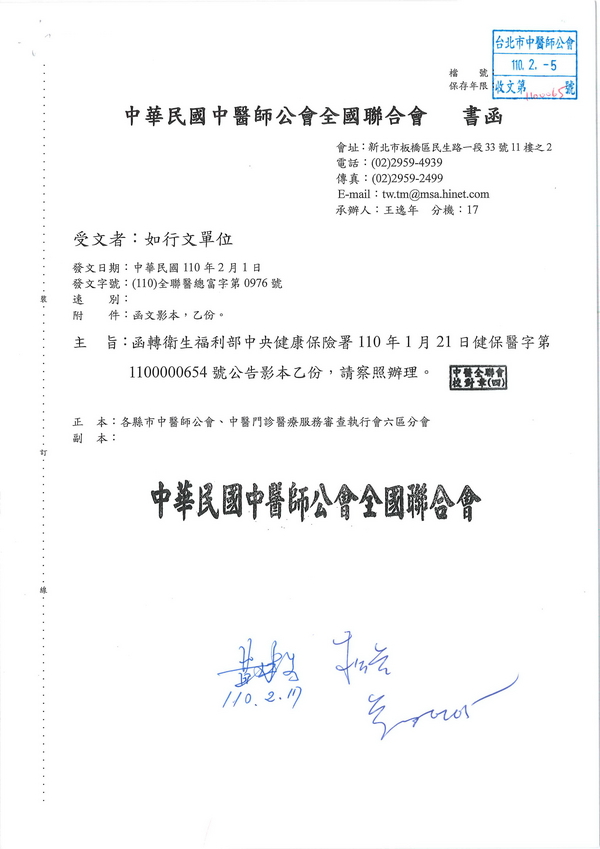 | 台北市中醫師公會 官網:http://www.tpcma.org.tw 地址:台北市中正區青島西路11號3樓 E-mail:tp.cma@msa.hinet.net 電話:(02)2314-3456(代表號) 傳真:(02)2314-8181 |