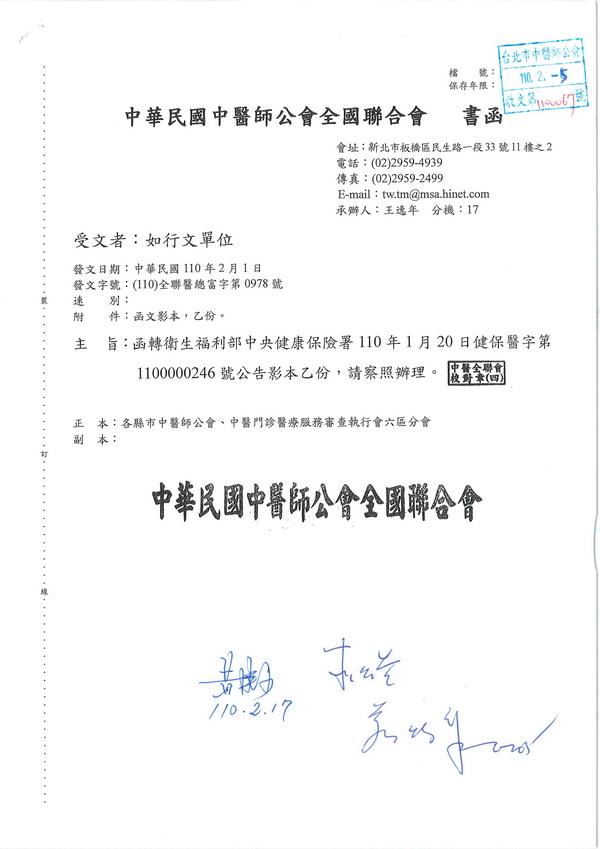 | 台北市中醫師公會 官網:http://www.tpcma.org.tw 地址:台北市中正區青島西路11號3樓 E-mail:tp.cma@msa.hinet.net 電話:(02)2314-3456(代表號) 傳真:(02)2314-8181 |