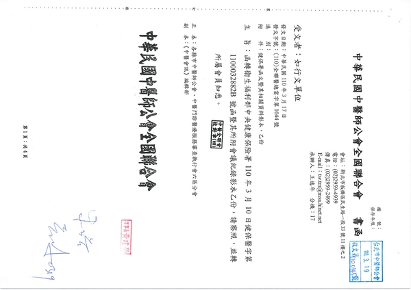 | 台北市中醫師公會 官網:http://www.tpcma.org.tw 地址:台北市中正區青島西路11號3樓 E-mail:tp.cma@msa.hinet.net 電話:(02)2314-3456(代表號) 傳真:(02)2314-8181 |