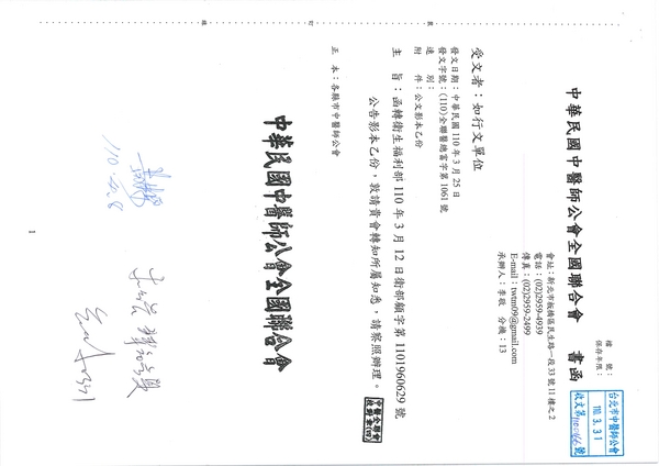 | 台北市中醫師公會 官網:http://www.tpcma.org.tw 地址:台北市中正區青島西路11號3樓 E-mail:tp.cma@msa.hinet.net 電話:(02)2314-3456(代表號) 傳真:(02)2314-8181 |