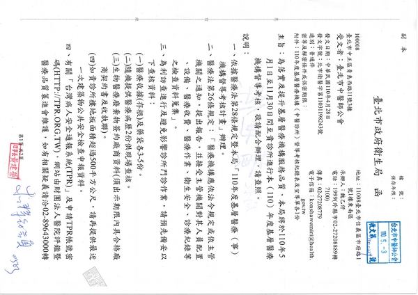 | 台北市中醫師公會 官網:http://www.tpcma.org.tw 地址:台北市中正區青島西路11號3樓 E-mail:tp.cma@msa.hinet.net 電話:(02)2314-3456(代表號) 傳真:(02)2314-8181 |