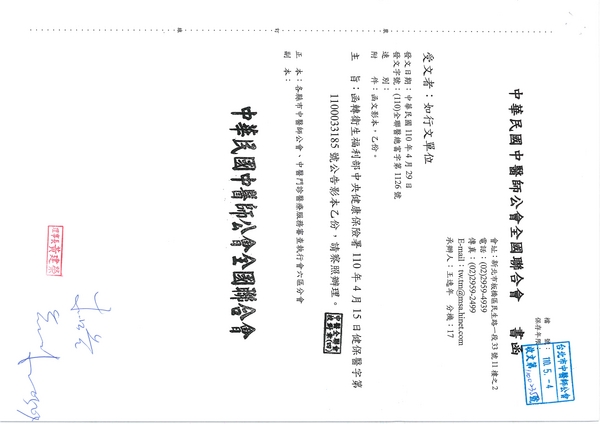 | 台北市中醫師公會 官網:http://www.tpcma.org.tw 地址:台北市中正區青島西路11號3樓 E-mail:tp.cma@msa.hinet.net 電話:(02)2314-3456(代表號) 傳真:(02)2314-8181 |