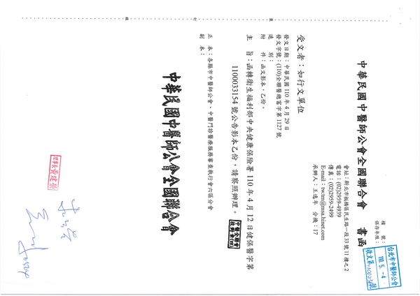| 台北市中醫師公會 官網:http://www.tpcma.org.tw 地址:台北市中正區青島西路11號3樓 E-mail:tp.cma@msa.hinet.net 電話:(02)2314-3456(代表號) 傳真:(02)2314-8181 |