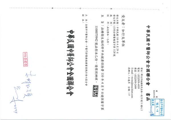 | 台北市中醫師公會 官網:http://www.tpcma.org.tw 地址:台北市中正區青島西路11號3樓 E-mail:tp.cma@msa.hinet.net 電話:(02)2314-3456(代表號) 傳真:(02)2314-8181 |