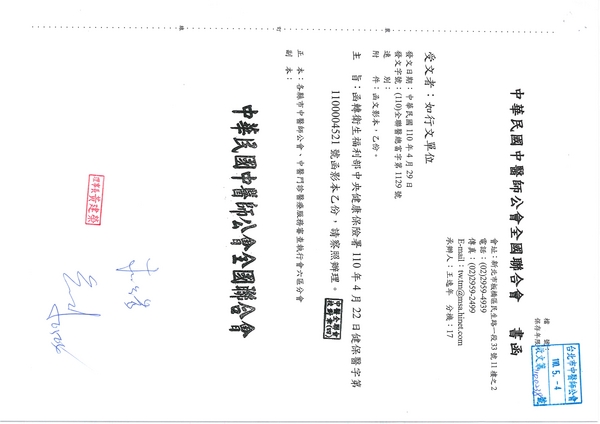 | 台北市中醫師公會 官網:http://www.tpcma.org.tw 地址:台北市中正區青島西路11號3樓 E-mail:tp.cma@msa.hinet.net 電話:(02)2314-3456(代表號) 傳真:(02)2314-8181 |