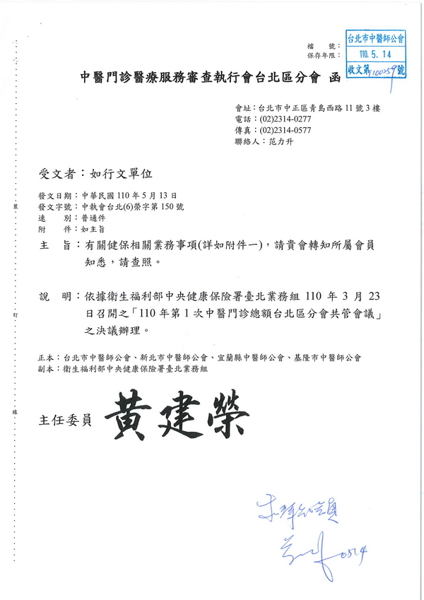 | 台北市中醫師公會 官網:http://www.tpcma.org.tw 地址:台北市中正區青島西路11號3樓 E-mail:tp.cma@msa.hinet.net 電話:(02)2314-3456(代表號) 傳真:(02)2314-8181 |