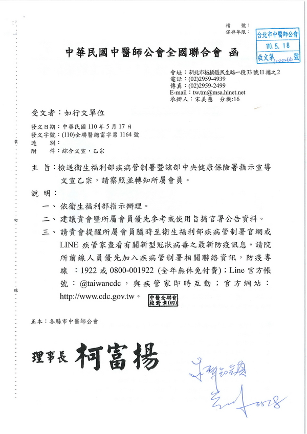 | 台北市中醫師公會 官網:http://www.tpcma.org.tw 地址:台北市中正區青島西路11號3樓 E-mail:tp.cma@msa.hinet.net 電話:(02)2314-3456(代表號) 傳真:(02)2314-8181 |