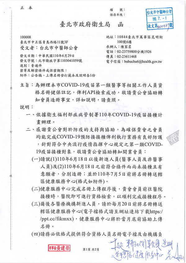 | 台北市中醫師公會 官網:http://www.tpcma.org.tw 地址:台北市中正區青島西路11號3樓 E-mail:tp.cma@msa.hinet.net 電話:(02)2314-3456(代表號) 傳真:(02)2314-8181 |