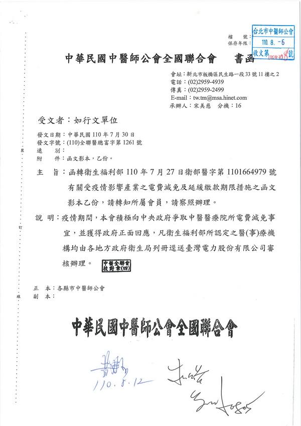 | 台北市中醫師公會 官網:http://www.tpcma.org.tw 地址:台北市中正區青島西路11號3樓 E-mail:tp.cma@msa.hinet.net 電話:(02)2314-3456(代表號) 傳真:(02)2314-8181 |