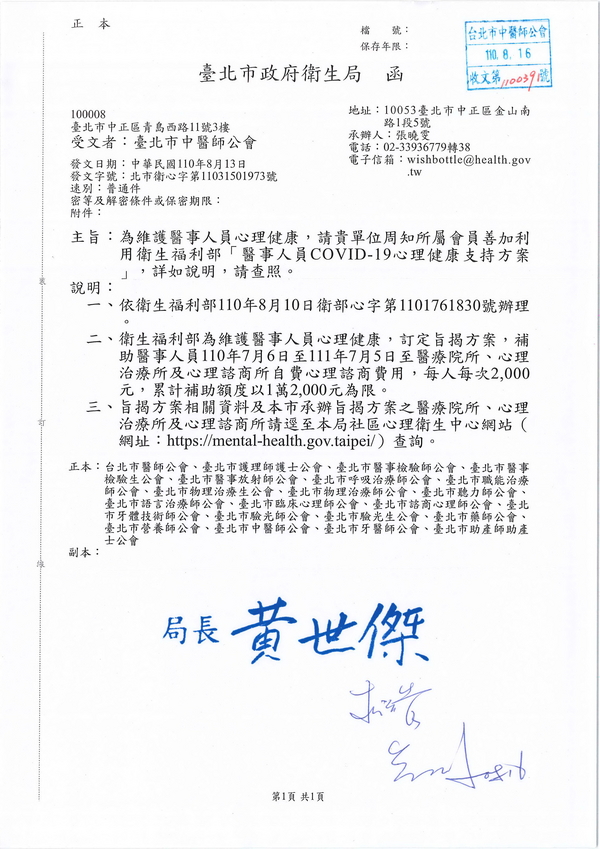 | 台北市中醫師公會 官網:http://www.tpcma.org.tw 地址:台北市中正區青島西路11號3樓 E-mail:tp.cma@msa.hinet.net 電話:(02)2314-3456(代表號) 傳真:(02)2314-8181 |
