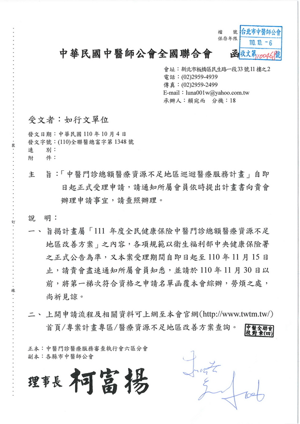 | 台北市中醫師公會 官網:http://www.tpcma.org.tw 地址:台北市中正區青島西路11號3樓 E-mail:tp.cma@msa.hinet.net 電話:(02)2314-3456(代表號) 傳真:(02)2314-8181 |