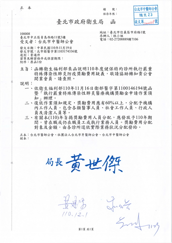 | 台北市中醫師公會 官網:http://www.tpcma.org.tw 地址:台北市中正區青島西路11號3樓 E-mail:tp.cma@msa.hinet.net 電話:(02)2314-3456(代表號) 傳真:(02)2314-8181 |