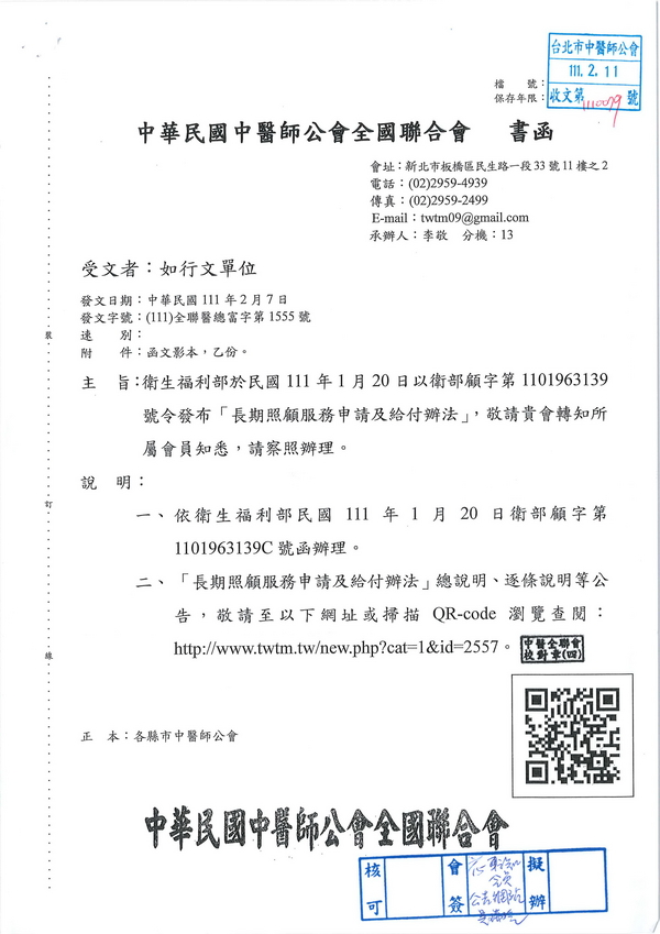 | 台北市中醫師公會 官網:http://www.tpcma.org.tw 地址:台北市中正區青島西路11號3樓 E-mail:tp.cma@msa.hinet.net 電話:(02)2314-3456(代表號) 傳真:(02)2314-8181 |
