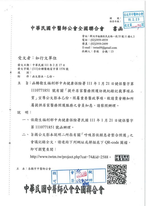 | 台北市中醫師公會 官網:http://www.tpcma.org.tw 地址:台北市中正區青島西路11號3樓 E-mail:tp.cma@msa.hinet.net 電話:(02)2314-3456(代表號) 傳真:(02)2314-8181 |