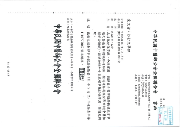 | 台北市中醫師公會 官網:http://www.tpcma.org.tw 地址:台北市中正區青島西路11號3樓 E-mail:tp.cma@msa.hinet.net 電話:(02)2314-3456(代表號) 傳真:(02)2314-8181 |