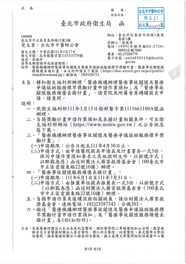| 台北市中醫師公會 官網:http://www.tpcma.org.tw 地址:台北市中正區青島西路11號3樓 E-mail:tp.cma@msa.hinet.net 電話:(02)2314-3456(代表號) 傳真:(02)2314-8181 |
