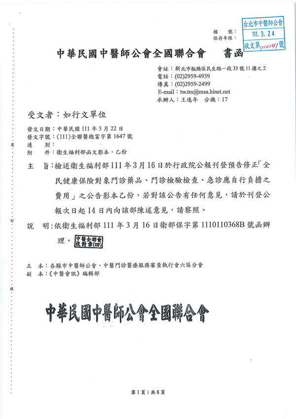 | 台北市中醫師公會 官網:http://www.tpcma.org.tw 地址:台北市中正區青島西路11號3樓 E-mail:tp.cma@msa.hinet.net 電話:(02)2314-3456(代表號) 傳真:(02)2314-8181 |