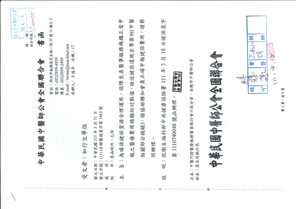 | 台北市中醫師公會 官網:http://www.tpcma.org.tw 地址:台北市中正區青島西路11號3樓 E-mail:tp.cma@msa.hinet.net 電話:(02)2314-3456(代表號) 傳真:(02)2314-8181 |