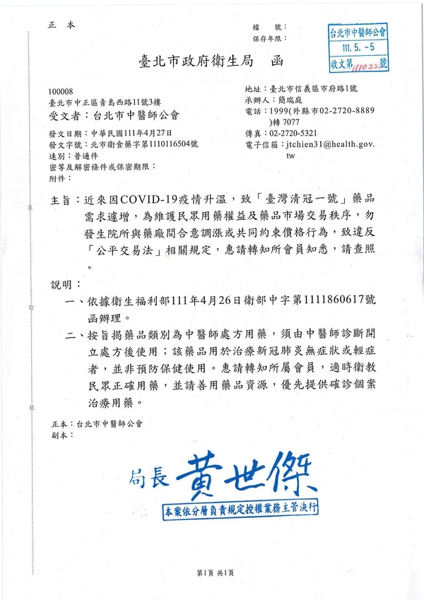 | 台北市中醫師公會 官網:http://www.tpcma.org.tw 地址:台北市中正區青島西路11號3樓 E-mail:tp.cma@msa.hinet.net 電話:(02)2314-3456(代表號) 傳真:(02)2314-8181 |