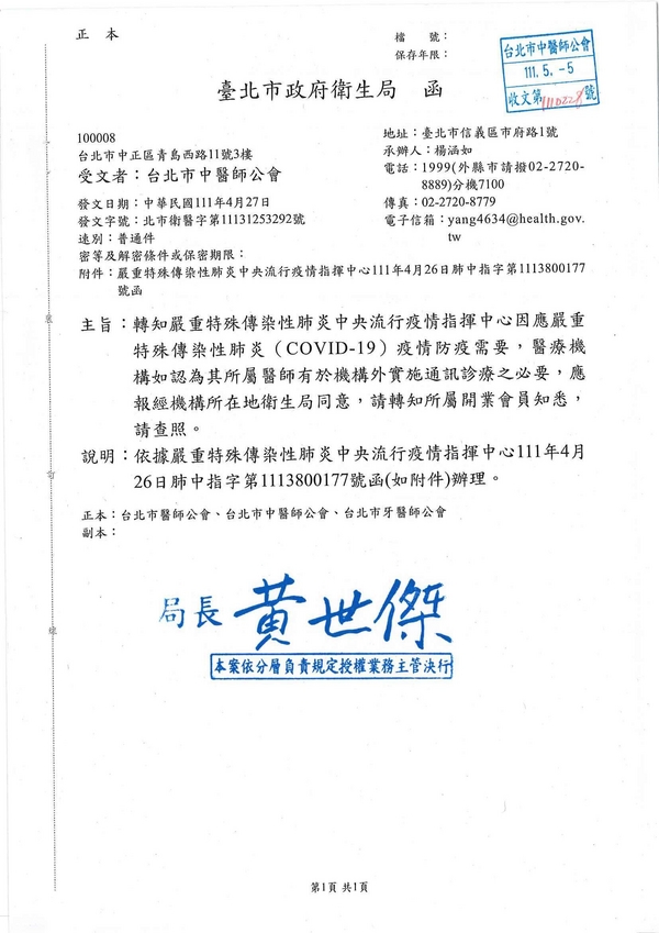 | 台北市中醫師公會 官網:http://www.tpcma.org.tw 地址:台北市中正區青島西路11號3樓 E-mail:tp.cma@msa.hinet.net 電話:(02)2314-3456(代表號) 傳真:(02)2314-8181 |