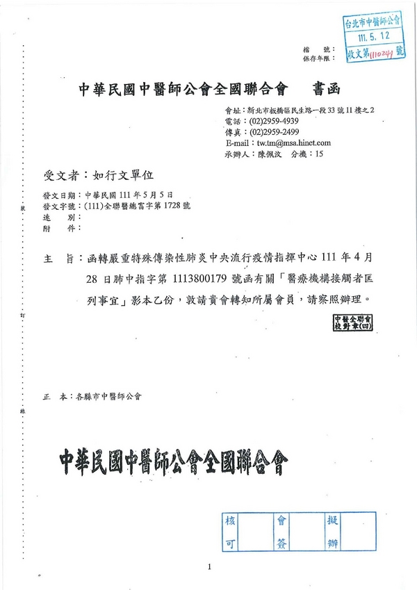 | 台北市中醫師公會 官網:http://www.tpcma.org.tw 地址:台北市中正區青島西路11號3樓 E-mail:tp.cma@msa.hinet.net 電話:(02)2314-3456(代表號) 傳真:(02)2314-8181 |