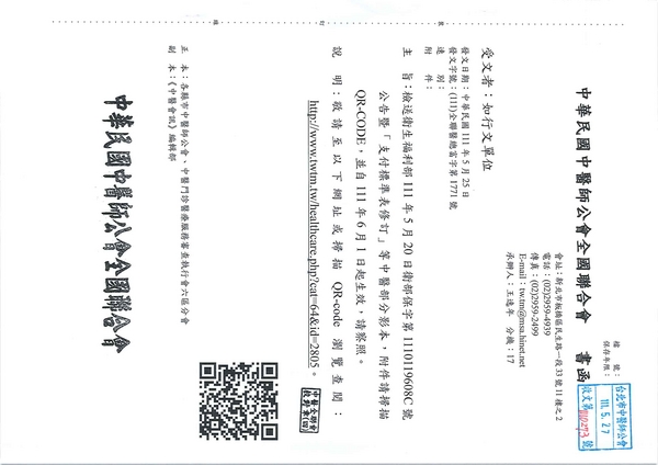 | 台北市中醫師公會 官網:http://www.tpcma.org.tw 地址:台北市中正區青島西路11號3樓 E-mail:tp.cma@msa.hinet.net 電話:(02)2314-3456(代表號) 傳真:(02)2314-8181 |
