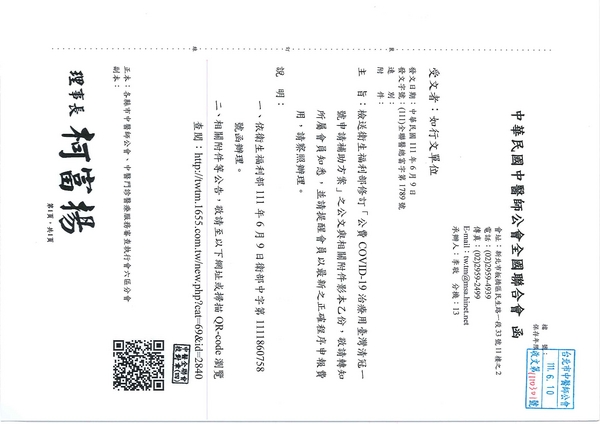 | 台北市中醫師公會 官網:http://www.tpcma.org.tw 地址:台北市中正區青島西路11號3樓 E-mail:tp.cma@msa.hinet.net 電話:(02)2314-3456(代表號) 傳真:(02)2314-8181 |