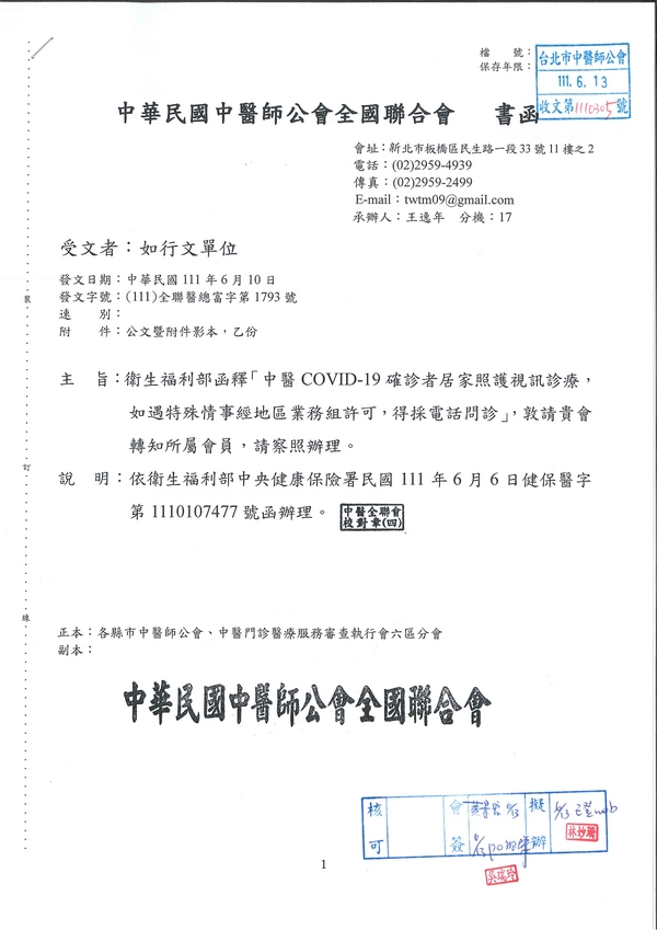 | 台北市中醫師公會 官網:http://www.tpcma.org.tw 地址:台北市中正區青島西路11號3樓 E-mail:tp.cma@msa.hinet.net 電話:(02)2314-3456(代表號) 傳真:(02)2314-8181 |