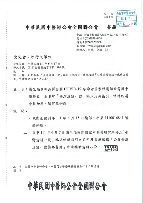 | 台北市中醫師公會 官網:http://www.tpcma.org.tw 地址:台北市中正區青島西路11號3樓 E-mail:tp.cma@msa.hinet.net 電話:(02)2314-3456(代表號) 傳真:(02)2314-8181 |