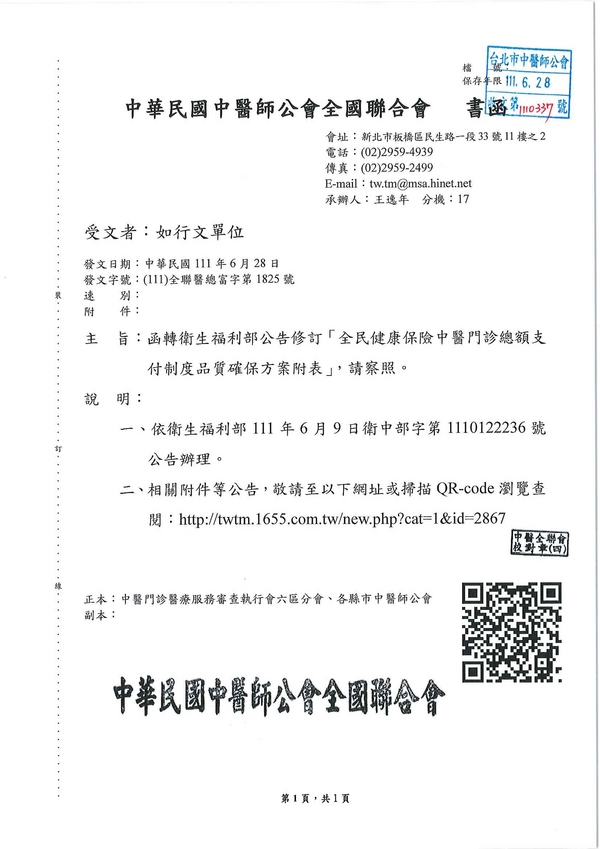 | 台北市中醫師公會 官網:http://www.tpcma.org.tw 地址:台北市中正區青島西路11號3樓 E-mail:tp.cma@msa.hinet.net 電話:(02)2314-3456(代表號) 傳真:(02)2314-8181 |