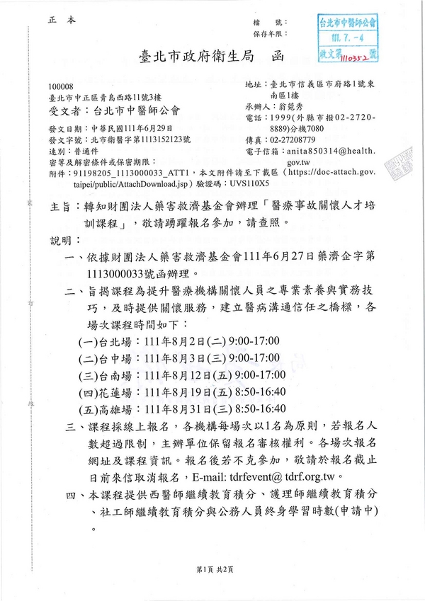 | 台北市中醫師公會 官網:http://www.tpcma.org.tw 地址:台北市中正區青島西路11號3樓 E-mail:tp.cma@msa.hinet.net 電話:(02)2314-3456(代表號) 傳真:(02)2314-8181 |
