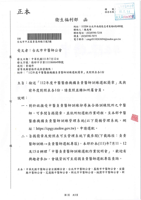 | 台北市中醫師公會 官網:http://www.tpcma.org.tw 地址:台北市中正區青島西路11號3樓 E-mail:tp.cma@msa.hinet.net 電話:(02)2314-3456(代表號) 傳真:(02)2314-8181 |