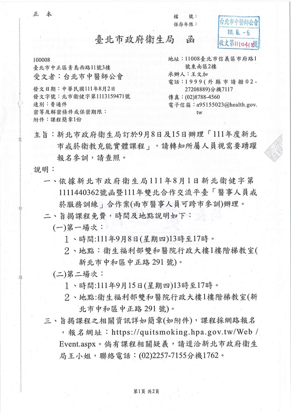 | 台北市中醫師公會 官網:http://www.tpcma.org.tw 地址:台北市中正區青島西路11號3樓 E-mail:tp.cma@msa.hinet.net 電話:(02)2314-3456(代表號) 傳真:(02)2314-8181 |