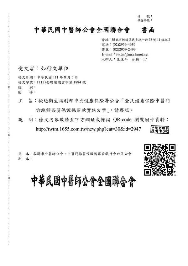 | 台北市中醫師公會 官網:http://www.tpcma.org.tw 地址:台北市中正區青島西路11號3樓 E-mail:tp.cma@msa.hinet.net 電話:(02)2314-3456(代表號) 傳真:(02)2314-8181 |