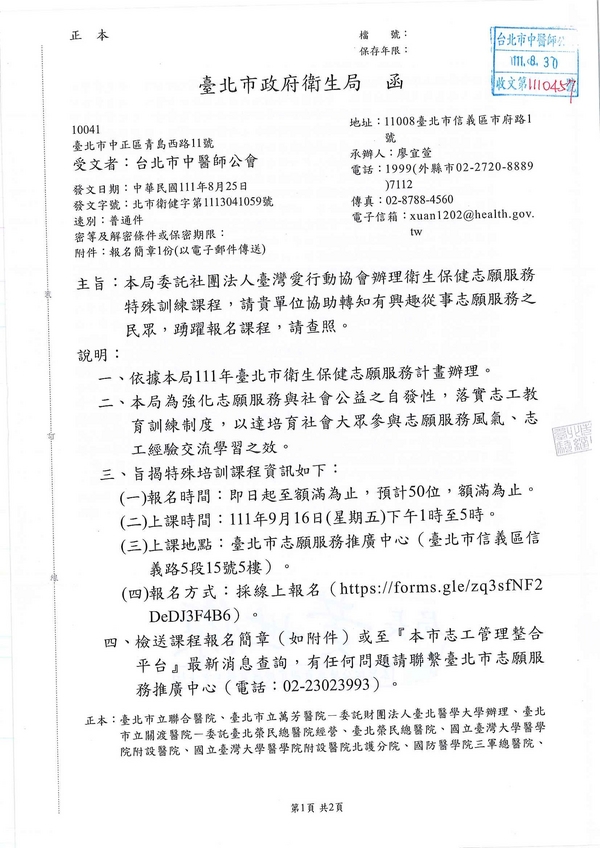 | 台北市中醫師公會 官網:http://www.tpcma.org.tw 地址:台北市中正區青島西路11號3樓 E-mail:tp.cma@msa.hinet.net 電話:(02)2314-3456(代表號) 傳真:(02)2314-8181 |