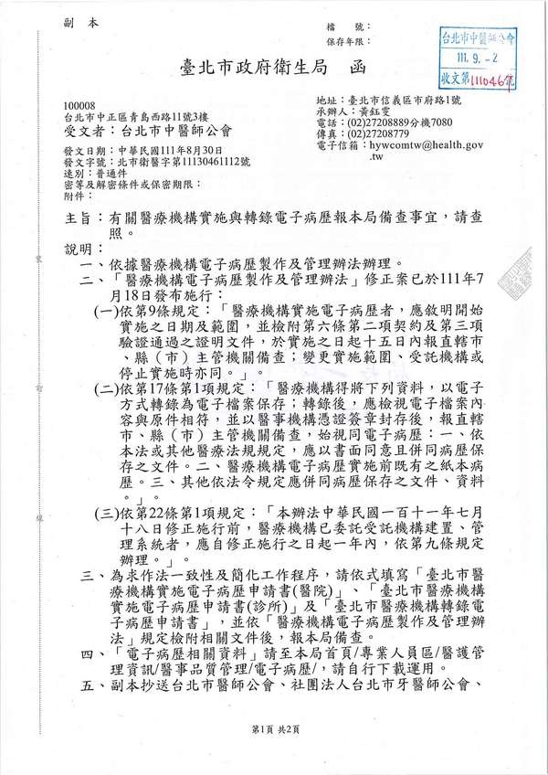 | 台北市中醫師公會 官網:http://www.tpcma.org.tw 地址:台北市中正區青島西路11號3樓 E-mail:tp.cma@msa.hinet.net 電話:(02)2314-3456(代表號) 傳真:(02)2314-8181 |