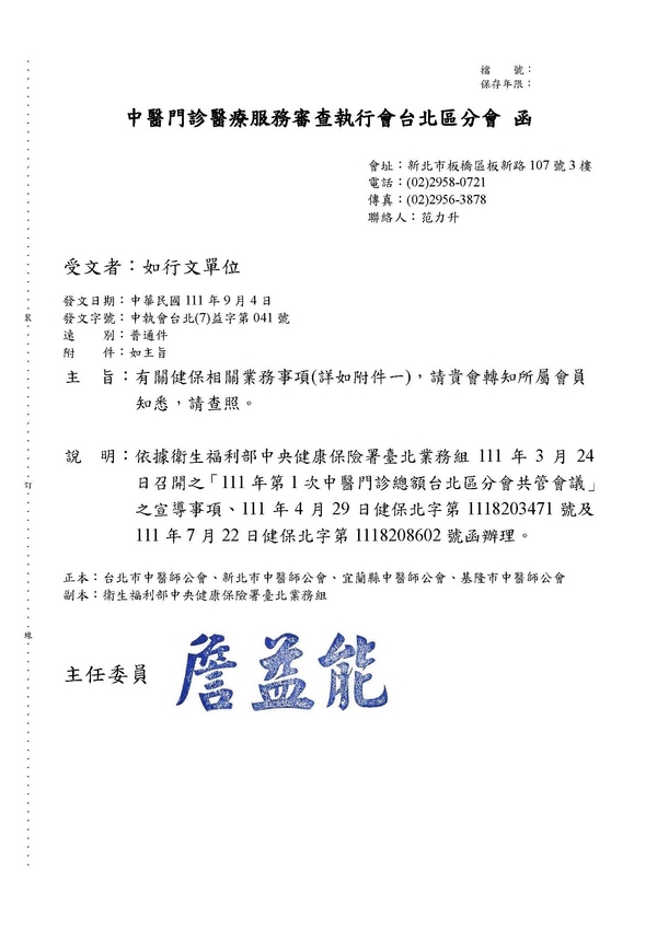 | 台北市中醫師公會 官網:http://www.tpcma.org.tw 地址:台北市中正區青島西路11號3樓 E-mail:tp.cma@msa.hinet.net 電話:(02)2314-3456(代表號) 傳真:(02)2314-8181 |