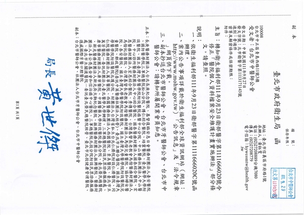 | 台北市中醫師公會 官網:http://www.tpcma.org.tw 地址:台北市中正區青島西路11號3樓 E-mail:tp.cma@msa.hinet.net 電話:(02)2314-3456(代表號) 傳真:(02)2314-8181 |