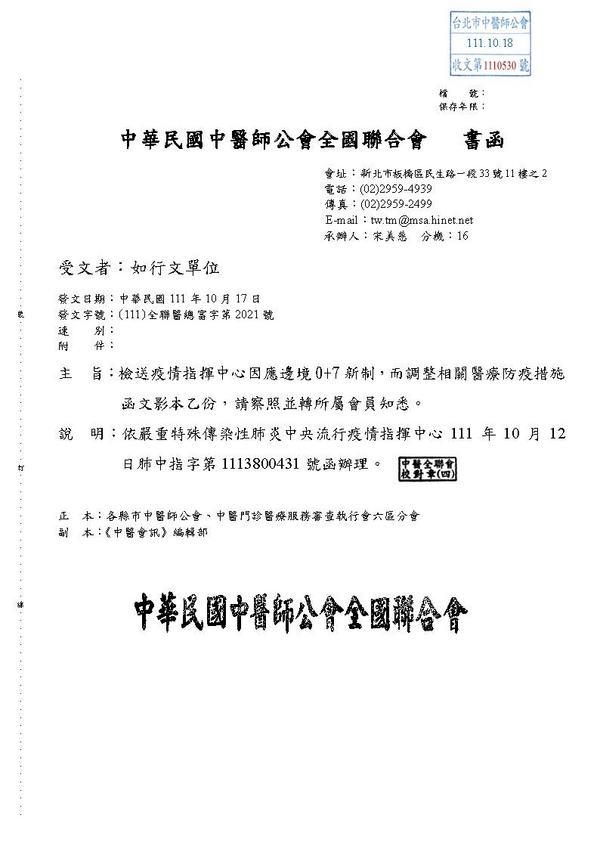 | 台北市中醫師公會 官網:http://www.tpcma.org.tw 地址:台北市中正區青島西路11號3樓 E-mail:tp.cma@msa.hinet.net 電話:(02)2314-3456(代表號) 傳真:(02)2314-8181 |