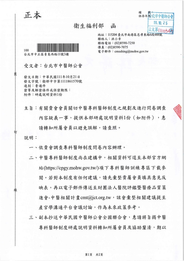 | 台北市中醫師公會 官網:http://www.tpcma.org.tw 地址:台北市中正區青島西路11號3樓 E-mail:tp.cma@msa.hinet.net 電話:(02)2314-3456(代表號) 傳真:(02)2314-8181 |