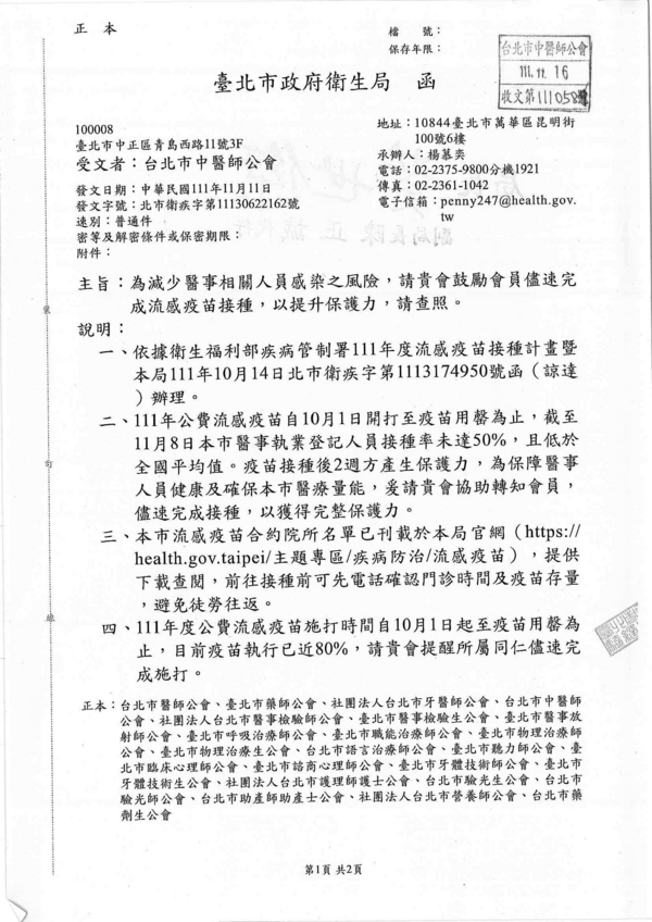 | 台北市中醫師公會 官網:http://www.tpcma.org.tw 地址:台北市中正區青島西路11號3樓 E-mail:tp.cma@msa.hinet.net 電話:(02)2314-3456(代表號) 傳真:(02)2314-8181 |